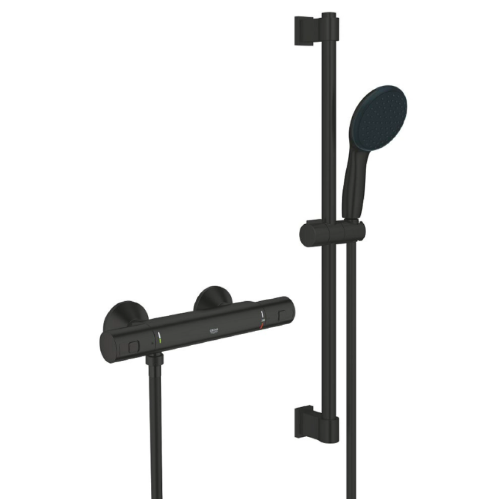 GROHE Vitalio Comfort Colonne de Douche avec Inverseur Manuel, Douche de Tête Carrée 25cm 2 jets (Pluie/SmartRain), Douchette Carrée 11cm 2 jets (Pluie/Stimulant), Economie d'Eau, Noir Mat, 266982431GROHE Sélection facile est idéalement positionné à l'arrière de la douchette à main. Il vous suffit de simplement tourner le bouton pour profiter du jet souhaité : choississez entre le jet Pluie pour une sensation de pluie d'été sur votre peau ou le jet Stimulant pour un massage revitalisant et un nettoyage efficace GROHE Economie d'Eau vous procure tout le confort que vous pouvez attendre d'une douche GROHE tout en réduisant votre consommation d'eau jusqu'à 40 %. Cette technologie d'économie d'eau a non seulement un impact positif sur l'environnement mais vous aidera aussi à réduire le montant de vos factures. La technologie GROHE DreamSpray transforme votre douche quotidienne en expérience voluptueusement relaxante. L'ingénierie de pointe de la pomme de douche garantit un flux équilibré depuis toutes les buses peu importe le type de jet que vous choisissez. Le calcaire n'est plus un problème avec nos buses SpeedClean : grâce au système anticalcaire intégré, vous trouverez les buses de votre douchette à main GROHE très faciles à nettoyer. Pour enlever tous les résidus de calcaire des buses flexibles en silicone, il suffit de simplement les essuyer avec votre main. Il suffit de l'essuyer avec un chiffon sec – la finition de surface lisse est résistante et assure un éclat lumineux durable. Vous gagnerez beaucoup de temps à nettoyer pendant que votre robinet est toujours neuf